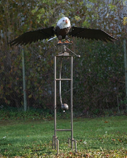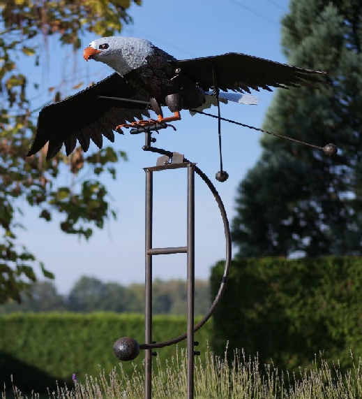 Cet aigle majestueux de 1,40 m de haut et 1,60 m d’envergure se balance sur son perchoir grâce à un contrepoids et agite lentement ses ailes au moindre souffle.