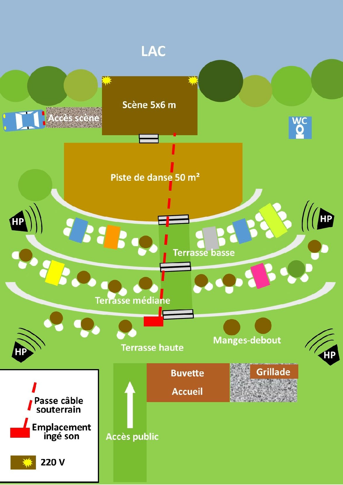 La scène est située au dessus du lac en contrebas des 3 terrasses.