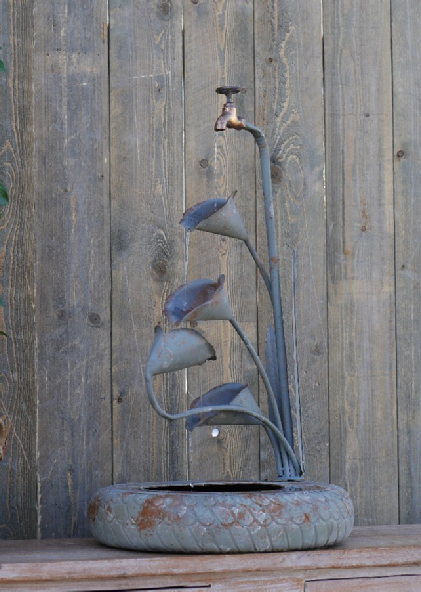 Une fontaine d’extérieur originale et amusante avec son robinet et ses quatre arums qui guident un filet d’eau jusqu’à un vieux pneu.